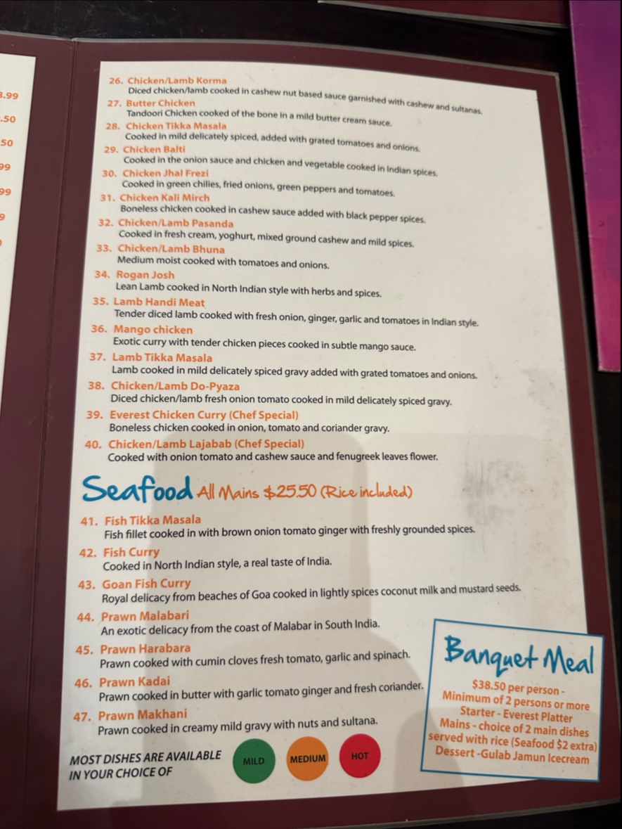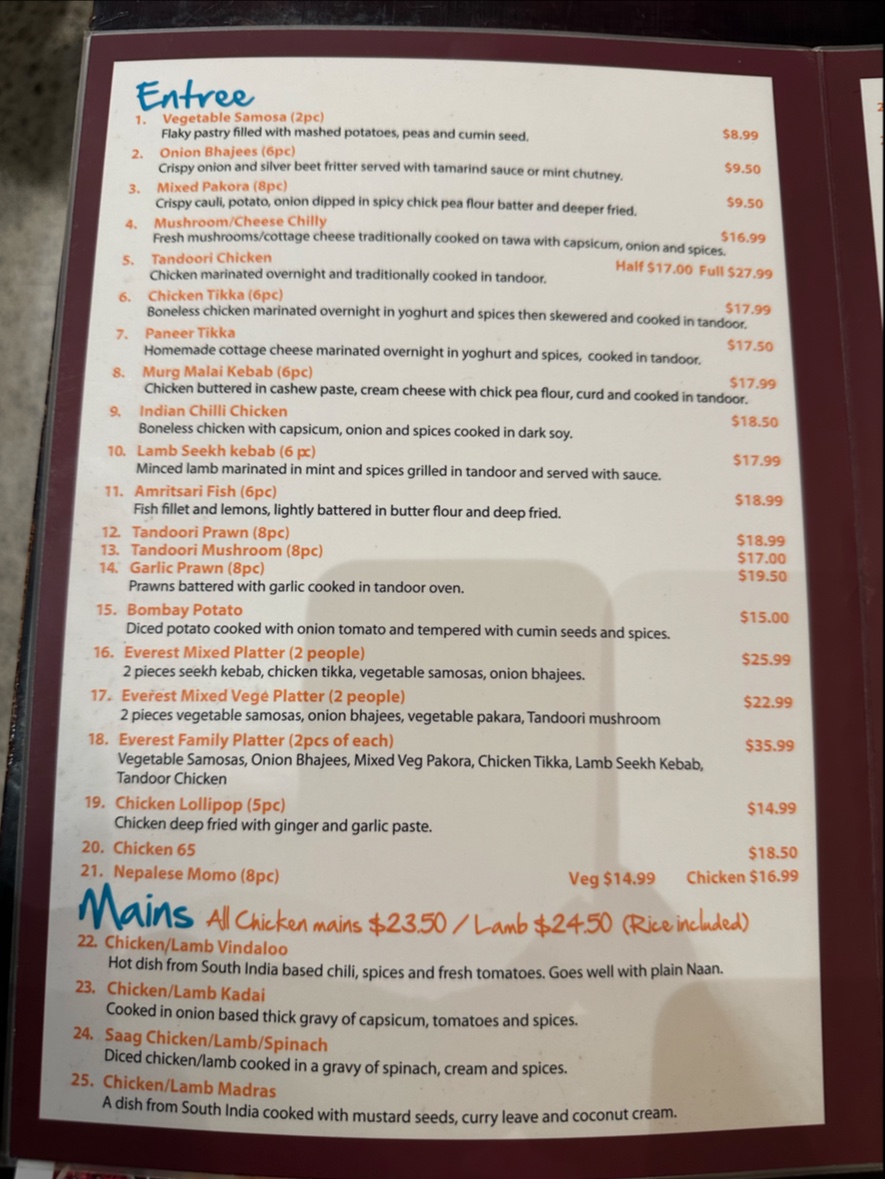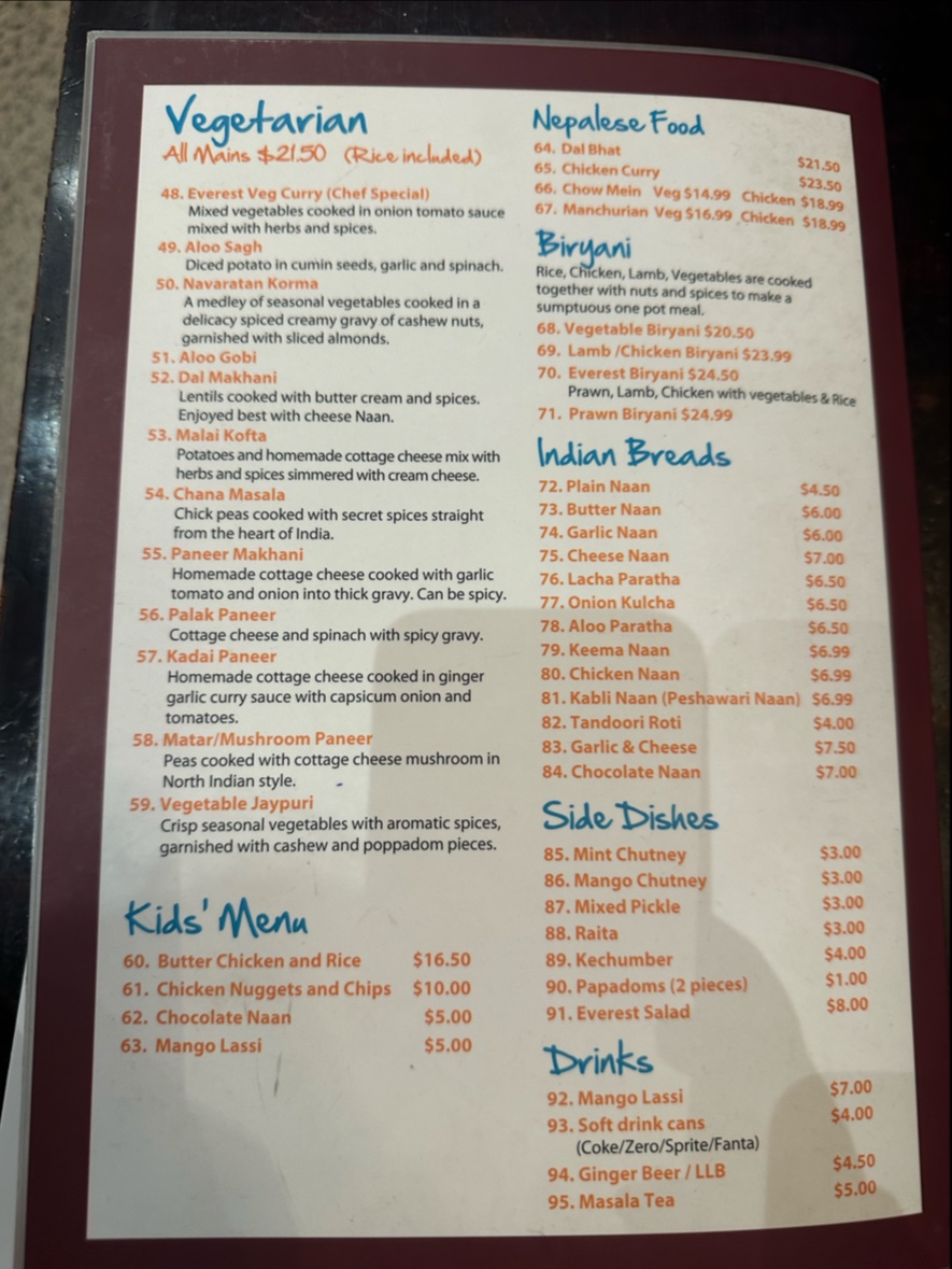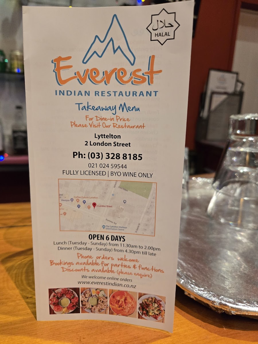If you're looking for authentic Indian flavors in a cozy spot, Everest Indian Restaurant - Lyttelton Menu offers just that. Located at 2 London Street, Lyttelton 8082, New Zealand, this menu brings a delicious array of traditional Indian dishes right to your table. From rich curries to mouthwatering tandoori, every dish is crafted with fresh, high-quality ingredients and spices. Whether you’re craving a flavorful biryani or a creamy butter chicken, there’s something for every taste. Don’t forget to try their signature naan, perfect for dipping into those irresistible gravies. Whether you’re dining in with friends or grabbing a takeaway, each dish promises a satisfying experience. The menu also includes a range of vegetarian and vegan options, ensuring that everyone can enjoy a delicious meal.